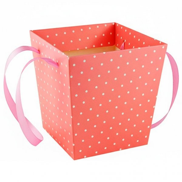 Кашпо картонное для цветов с ручкой Коралловое в горошек (1шт)