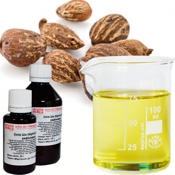 Внешний вид: рафинированное масло имеет белый цвет без выраженного запаха, нерафинированное масло дерева ши обычно с желтоватым оттенком и ярко выраженным ореховым ароматом.