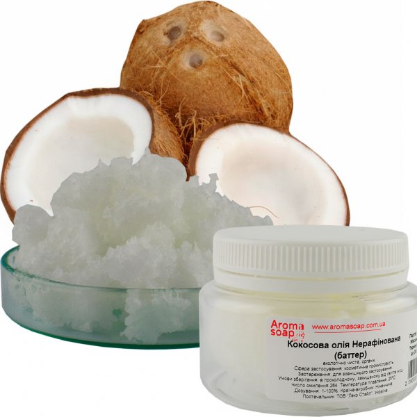 Нерафінована кокосова олія (баттер), отримана шляхом холодного віджиму м'якоті плодів кокоса. Завдяки такому способу олія кокоса максимально зберігає корисні властивості плоду і володіє відмінними характеристиками.
